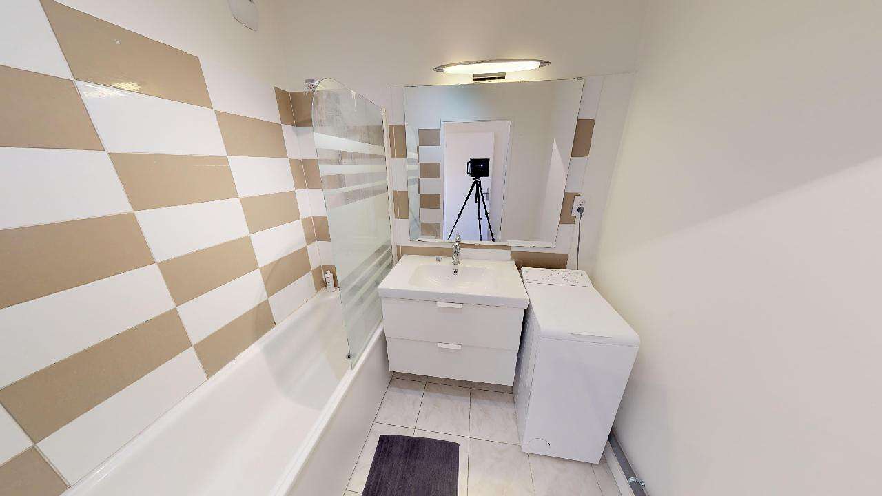 Une salle de bain avec baignoire, meuble vasque et machine à laver