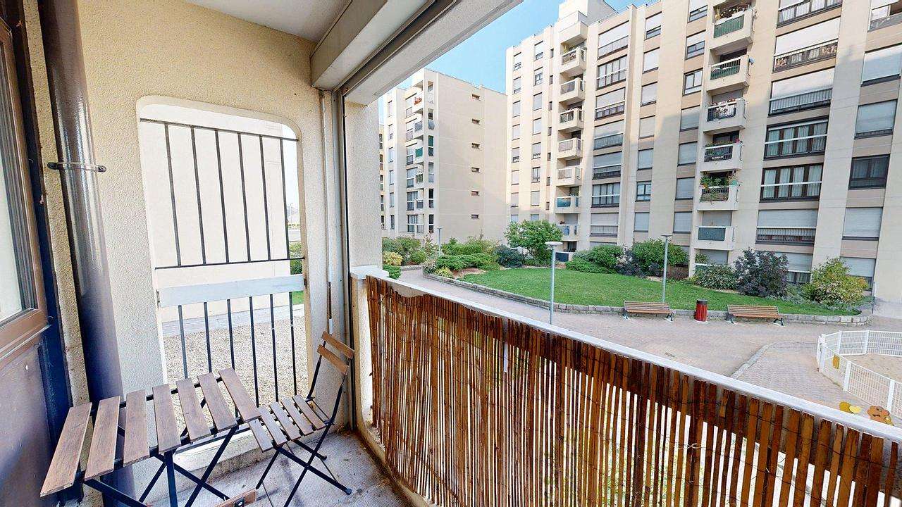 La pièce de vie est meublée avec un canapé, un fauteuil, un meuble TV avec télévision et une table à manger pouvant accueillir 4 personnes. Elle comprend également un réfrigérateur et une machine à laver pouvant être déplacés selon vos besoins. La pièce s’ouvre sur un balcon donnant sur un parc, aménagé avec une petite table de jardin et deux chaises.
