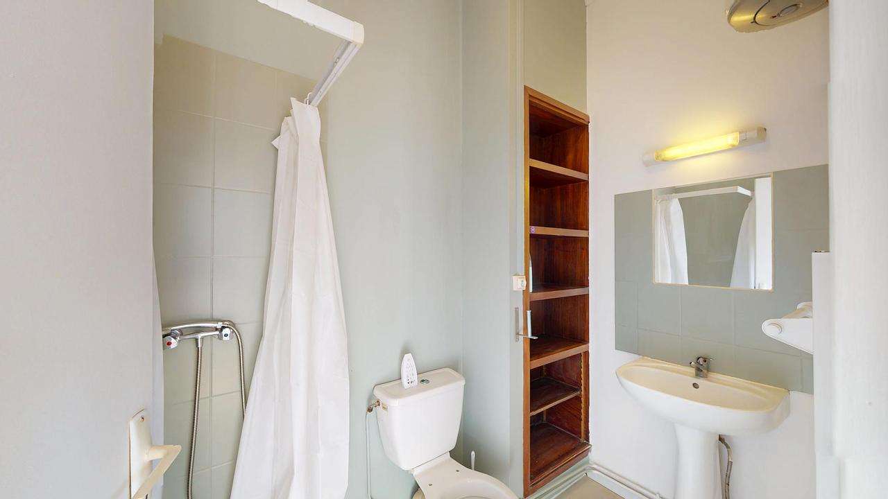 La salle d'eau se compose d'une douche, d'un lavabo avec un miroir, d'un meuble de rangements et d'un WC.
