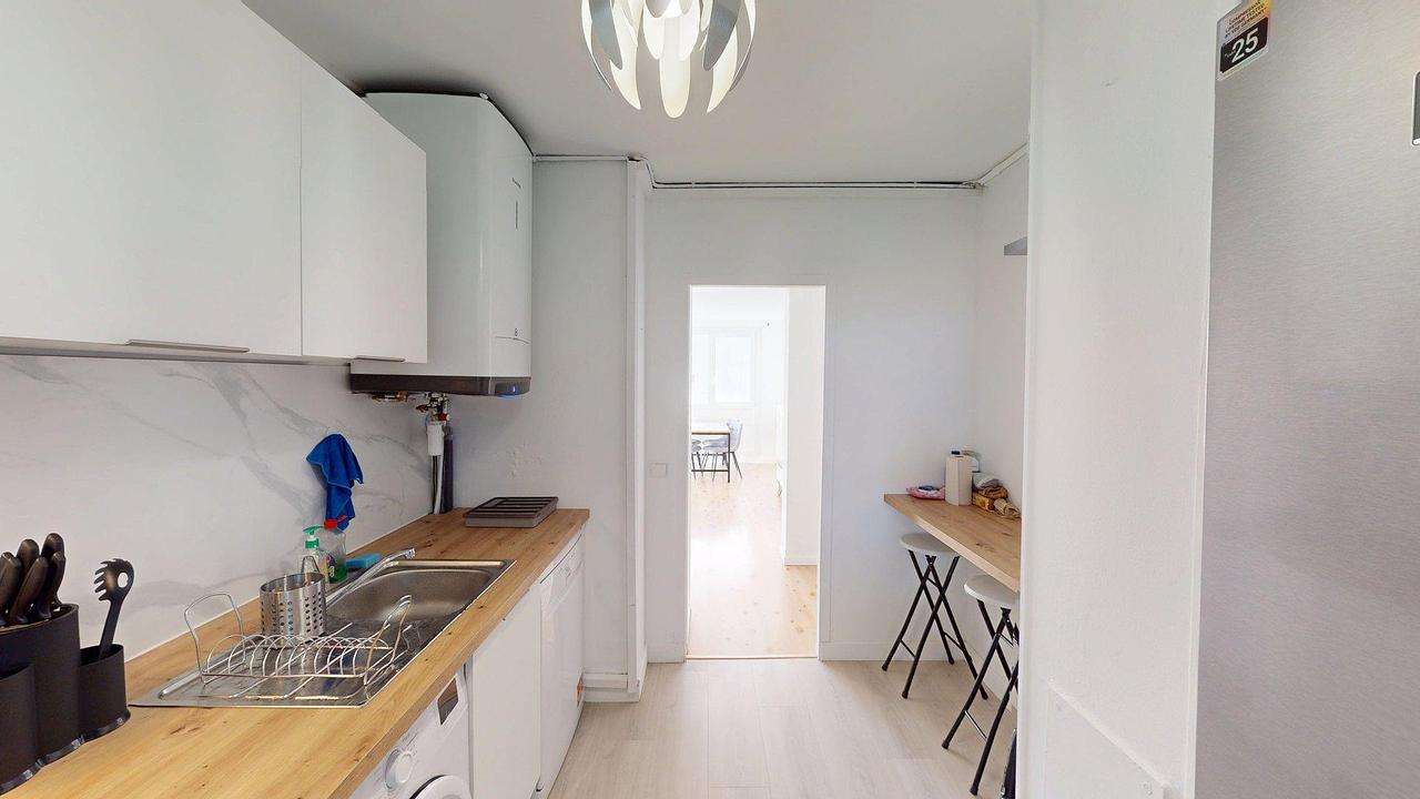 L’appartement dispose d’un séjour lumineux, aménagé avec un grand canapé, une table à manger et une télévision, offrant un espace convivial pour se retrouver entre colocataires.