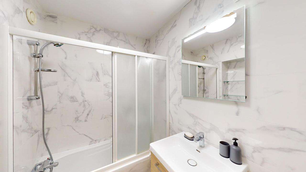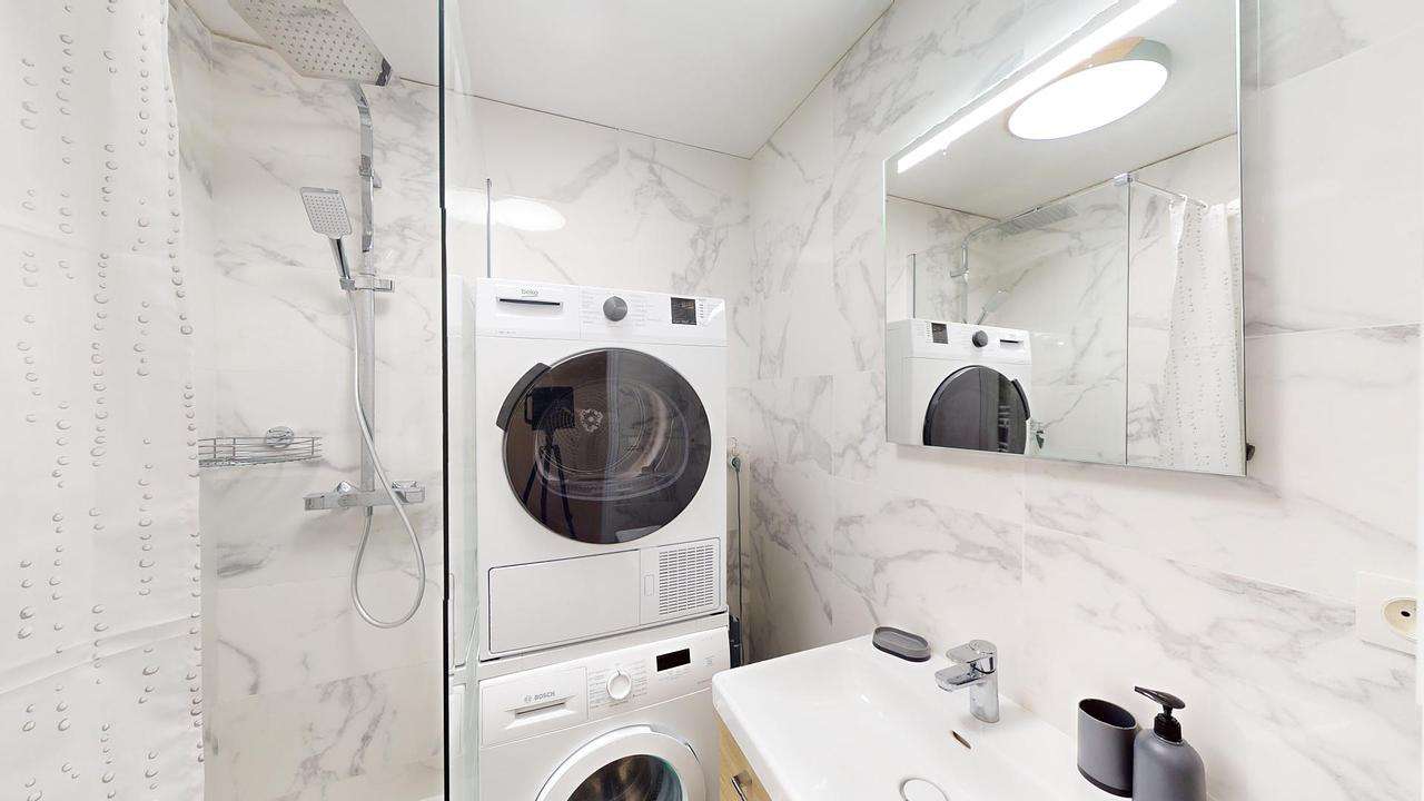 Une salle d’eau ➩ un meuble vasque / miroir, un lave-linge, un sèche-linge et une douche.