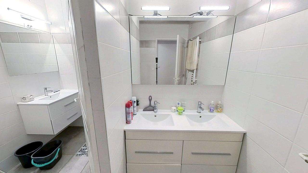 Une première salle d’eau spacieuse avec double vasque, miroirs, douche, machine à laver et sèche-linge