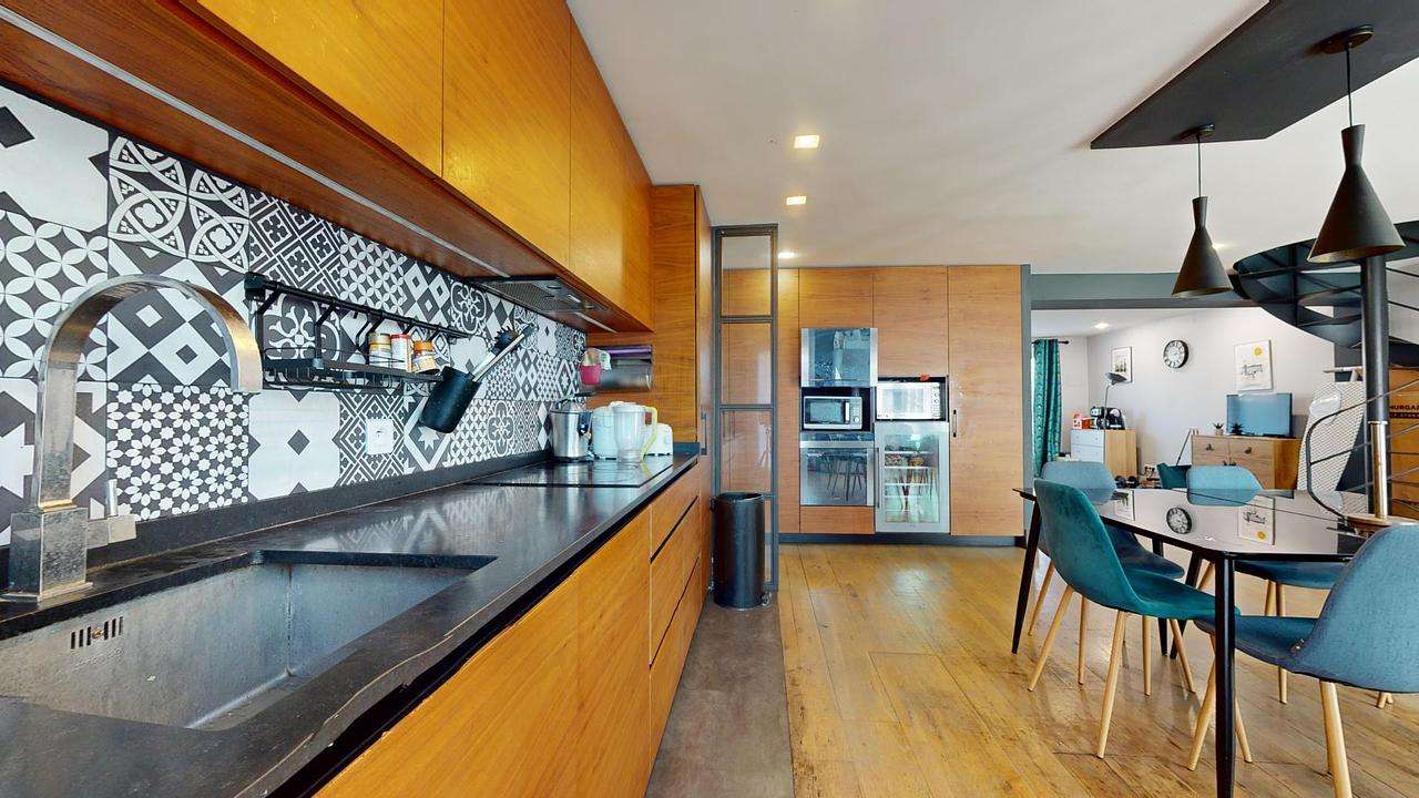 La grande cuisine ouverte est équipée de deux réfrigérateurs avec un congélateur, deux fours, deux micro-ondes, d'une bouilloire, d'un mixeur, d'un robot de cuisine, des plaques de cuisson avec une hotte, d'une cave à vin, d'un évier et de nombreux rangements. La pièce dispose aussi d'une table avec six chaises et d'un poêle. Cette pièce donne un accès direct sur une terrasse et un jardin.