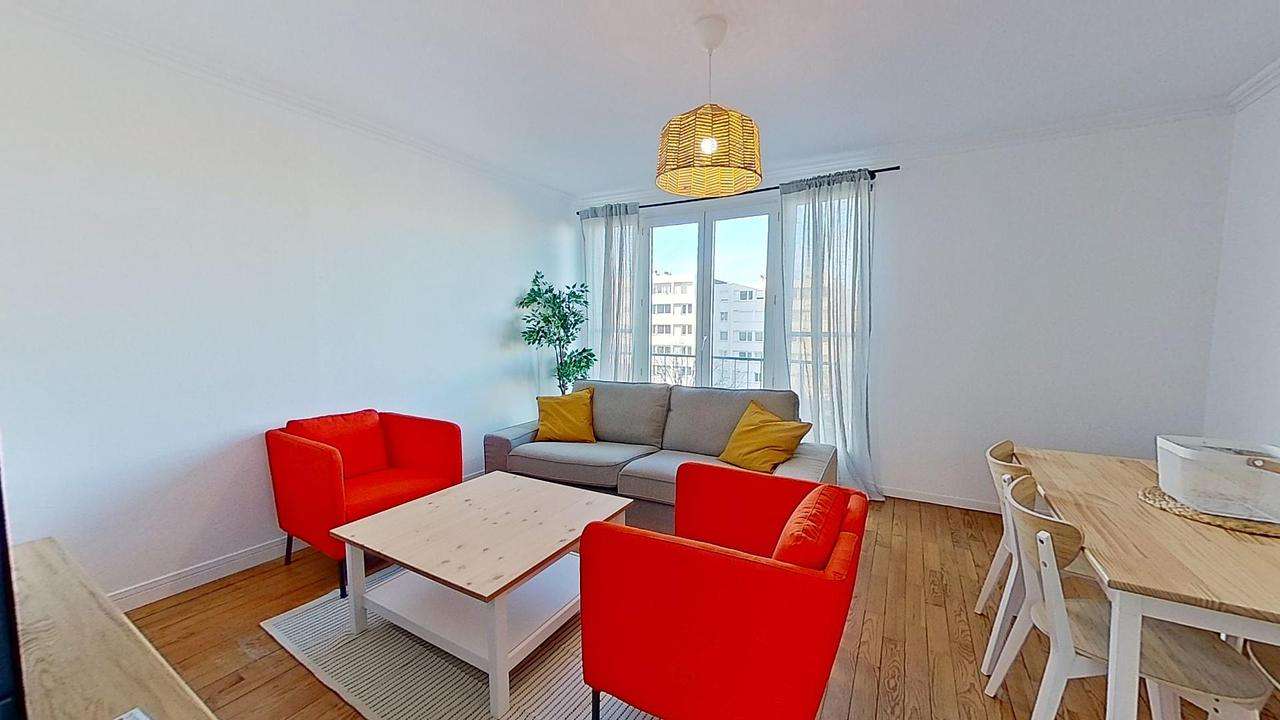 Cette colocation de quatre chambres s'ouvre sur une pièce vie spacieuse et aménagée d'un canapé, d'une table basse et deux fauteuils, d'un meuble TV avec une télévision ainsi que d'une table avec quatre chaises, idéal pour partager des repas entre colocataires.