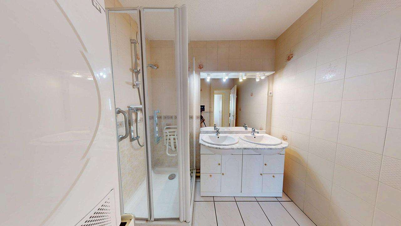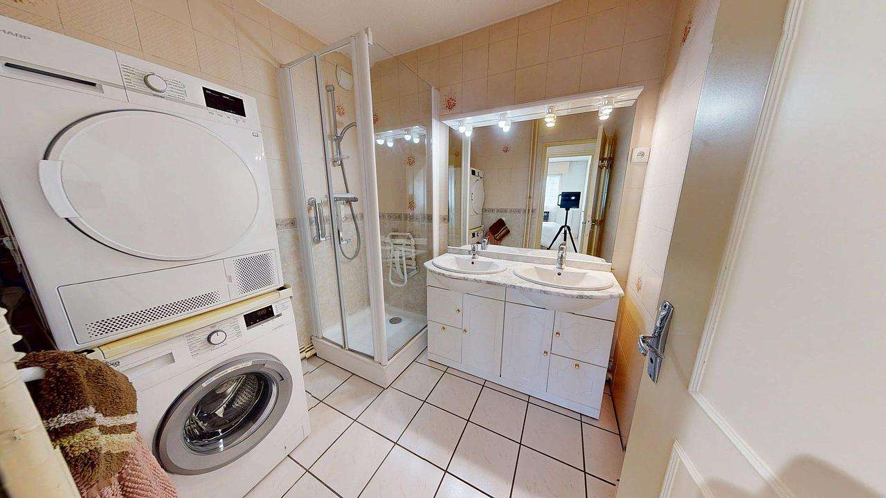 La seconde comprend une douche, un meuble vasque avec miroir, ainsi qu'un lave-linge et un sèche-linge pour votre confort.
