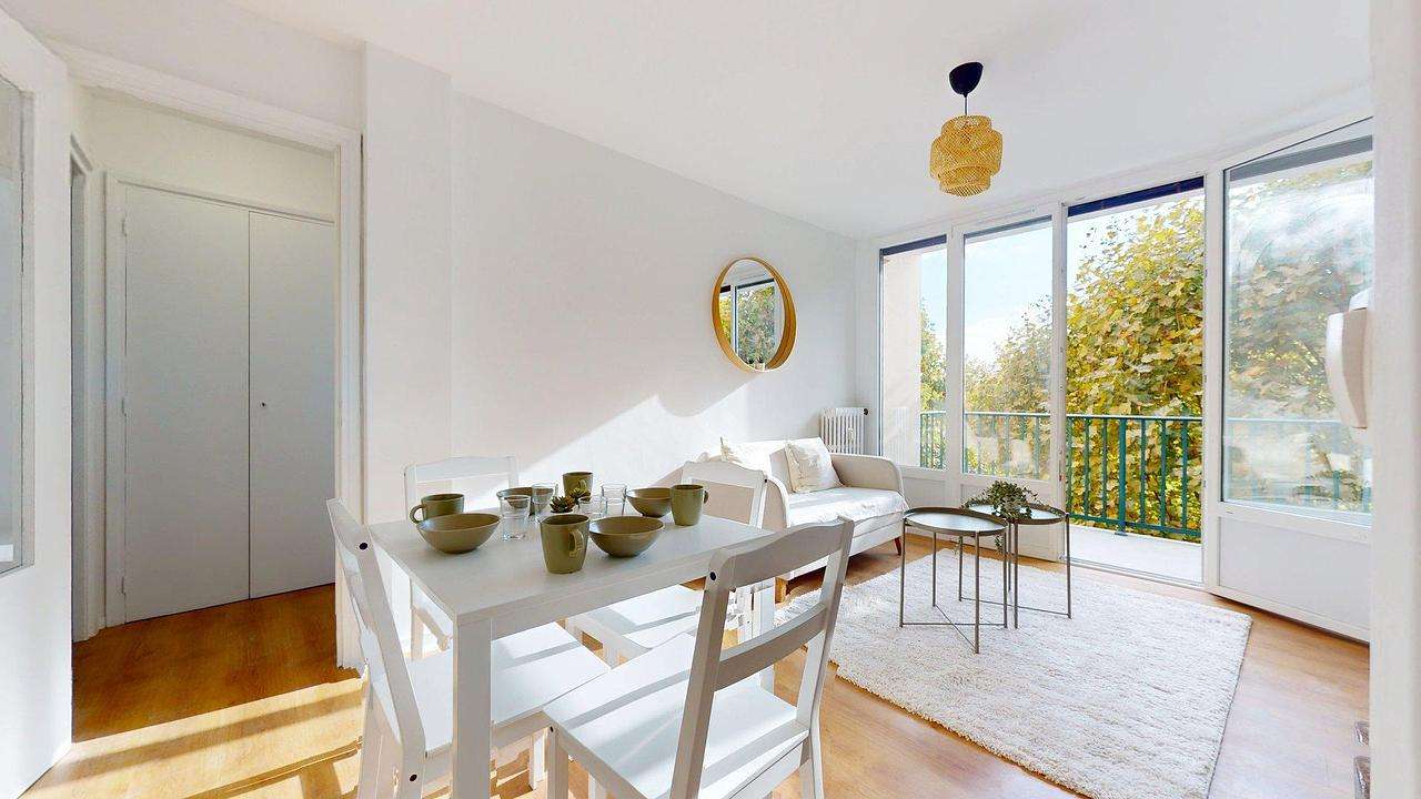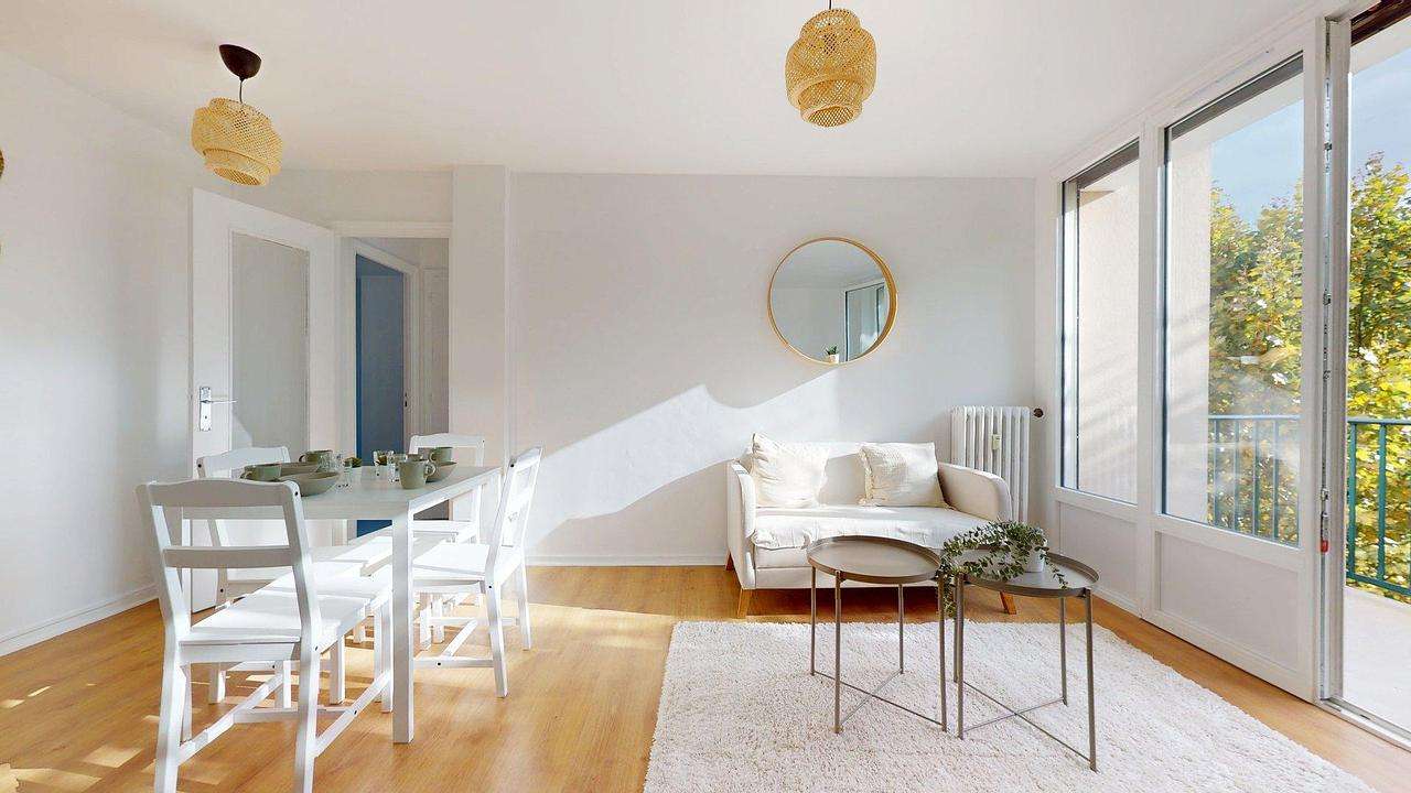 Entièrement rénové et décoré avec goût, l’appartement offre un cadre de vie lumineux et chaleureux. Le séjour spacieux dispose d’un coin salon convivial avec canapé, télévision et accès direct à un balcon donnant sur la verdure. La salle à manger attenante permet de partager des repas dans une atmosphère claire et apaisante.