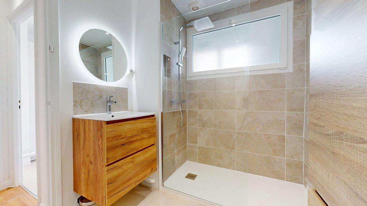 La salle d’eau moderne propose une grande douche à l’italienne, un meuble vasque en bois et un miroir lumineux.