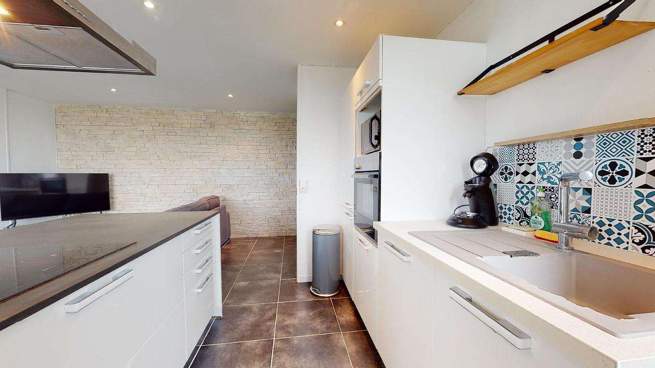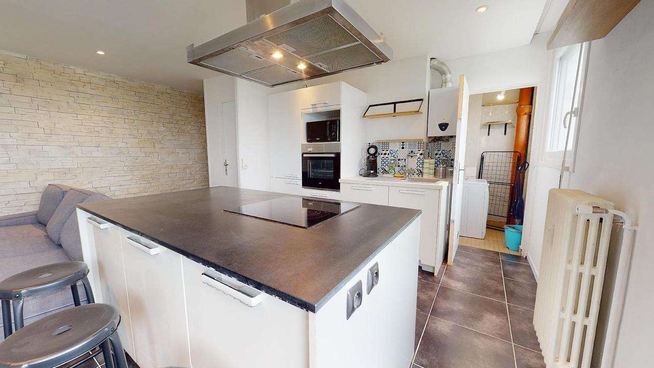 Dès l’entrée, vous entrerez dans une lumineuse pièce de vie. Elle à été équipée d’une cuisine intégrée et ouverte sur un espace salon (Muni d’un canapé d’une table basse, d’une TV, d’un tapis, d’un meuble de rangement, et d’un lampadaire). Cette cuisine dispose d’un ilot de travail, avec 4 plaques électrique et une hotte, et s’équipe d’un four, d’un micro-onde, ainsi que de nombreux placards de rangement. Enfin, vous disposerez d’une buanderie pour effectuer vos lessives.