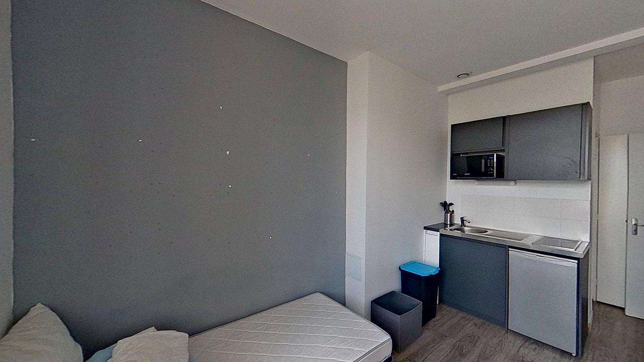 Le studio est composé d'une salle de bain (douche, meuble vasque...) et d'une kitchenette. Il est meublé d'un lit, d'un chevet, d'un bureau, d'une télévision ainsi que d'une armoire.