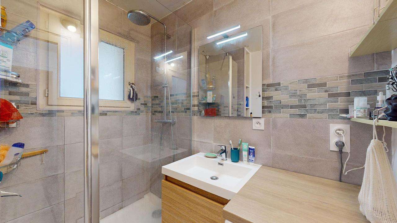 Une salle d'eau avec une douche, un meuble vasque, un miroir et des rangements vient compléter ce logement