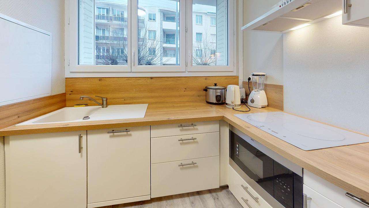 Juste en face, une cuisine parfaitement aménagée vous propose une plaque de cuisson surmontée d’une hotte, un four, un évier, un réfrigérateur avec congélateur, un lave vaisselle, un mange debout complété et de nombreux rangements.