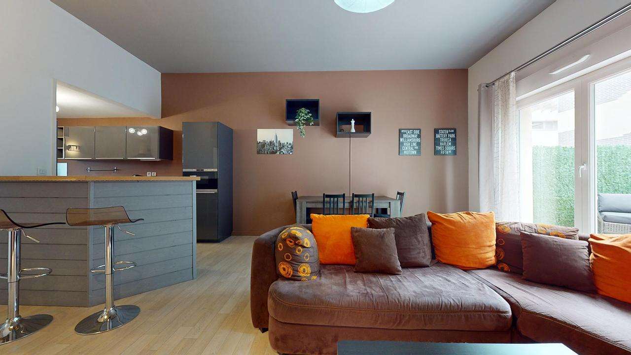 La maison s'ouvre sur une entrée avec rangements desservant un grand séjour avec cuisine ouverte. Celui-ci dispose d'un canapé, d'une table basse, d'un meuble TV, d'une TV et d'une table avec 4 chaises.
