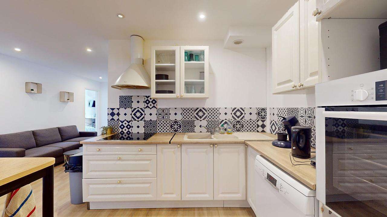 La cuisine est équipée d'un four, de plaques de cuisson, d'une hotte, d'un réfrigérateur avec congélateur, d'un évier, d'un micro-ondes, de nombreux rangements, d'un lave-vaisselle, d'une table haute avec 5 chaises et de tous les ustensiles et le petit électroménager nécessaire.