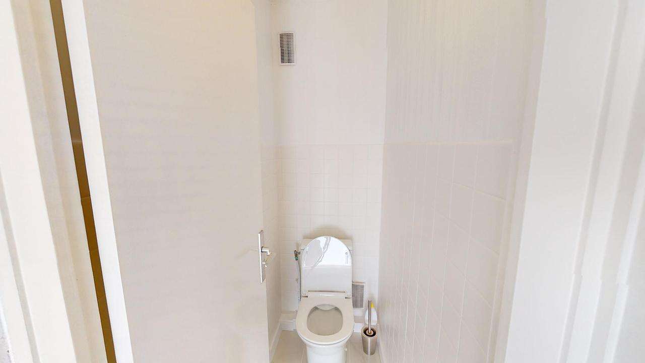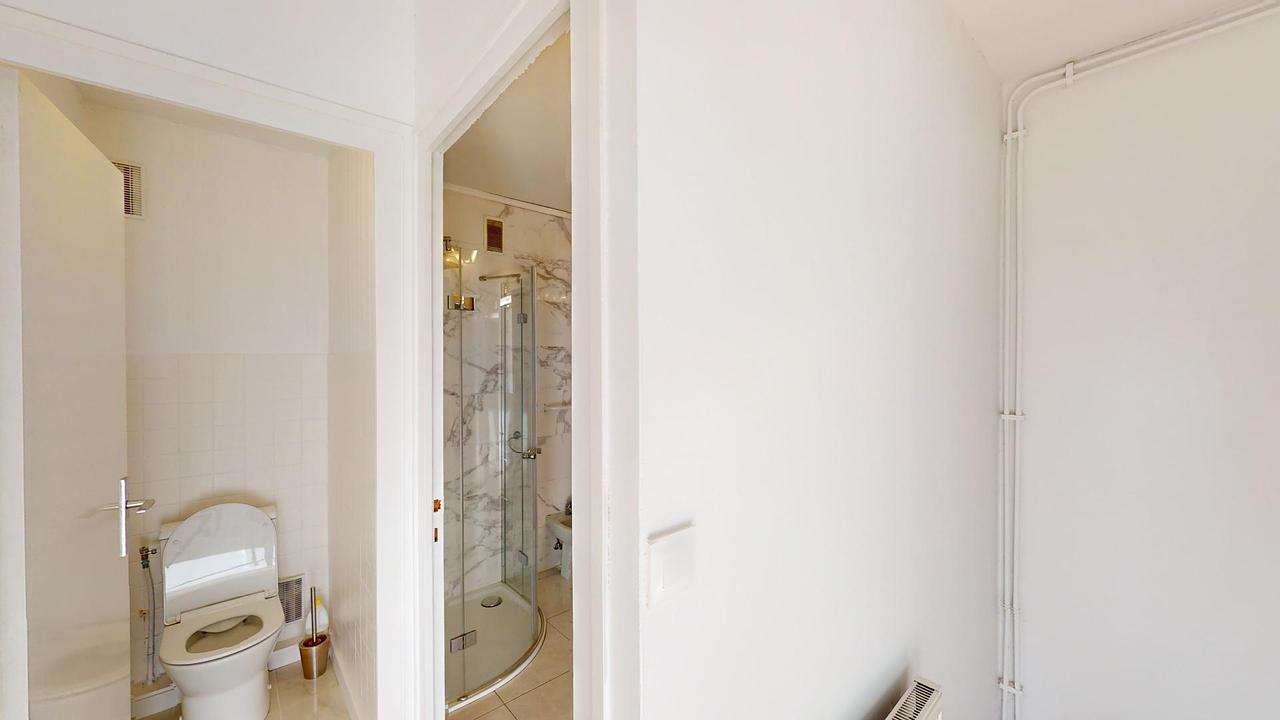 La salle d'eau comprend un meuble vasque, un miroir, une douche, un lave-linge, un sèche-serviette et des rangements. Les toilettes sont séparées.