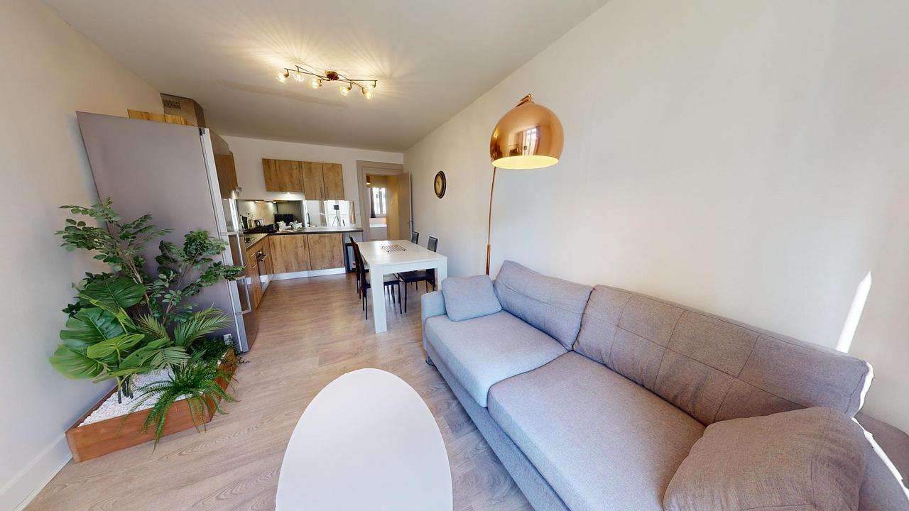 Cet appartement comprend une pièce de vie aménagée avec un coin salon : canapé , TV, tables basses, etc et une cuisine ouverte.