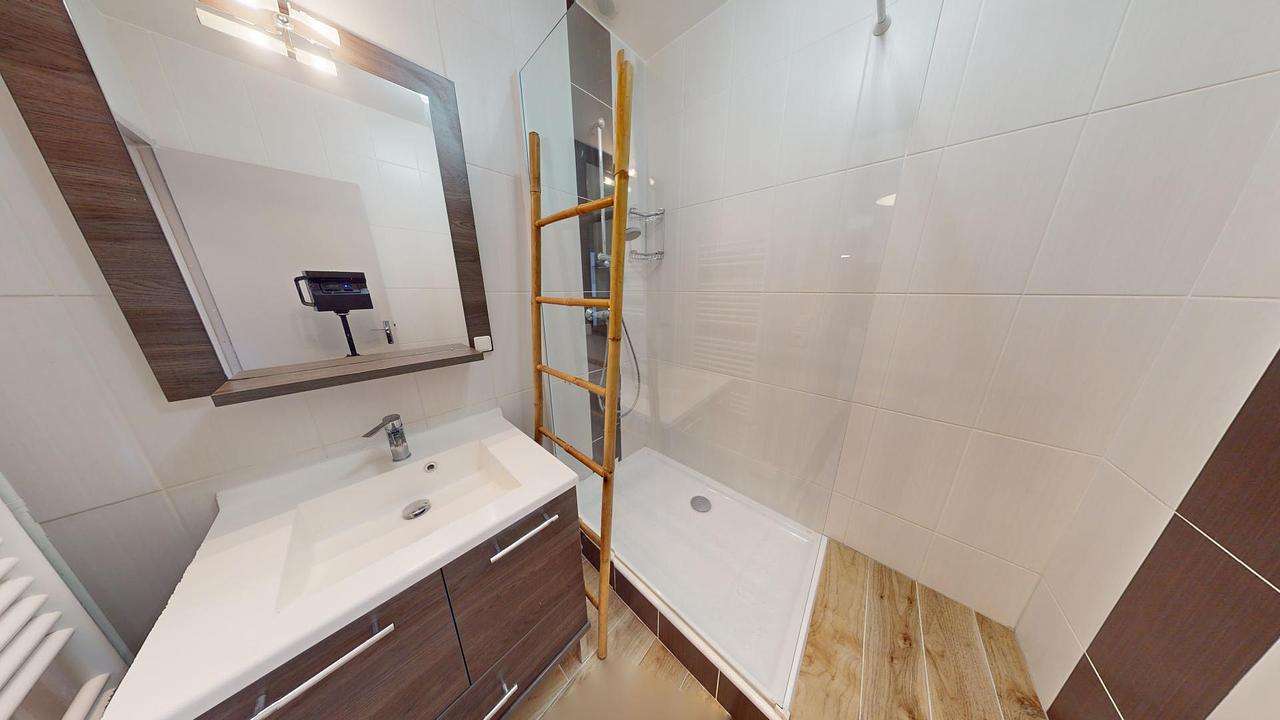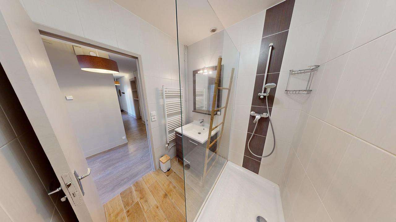 Une salle de bain avec grande douche et meuble vasque ainsi que des WC séparés viennent compléter ce logement.