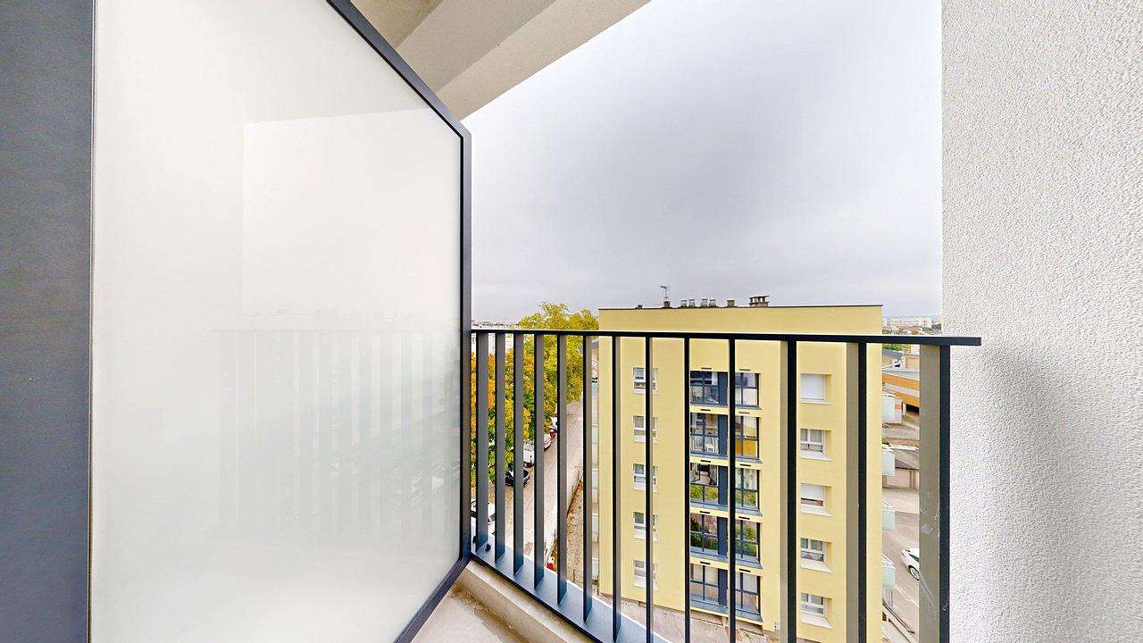 Un balcon vient prolonger la pièce de vie, avec une vue dégagée sur l’extérieur.