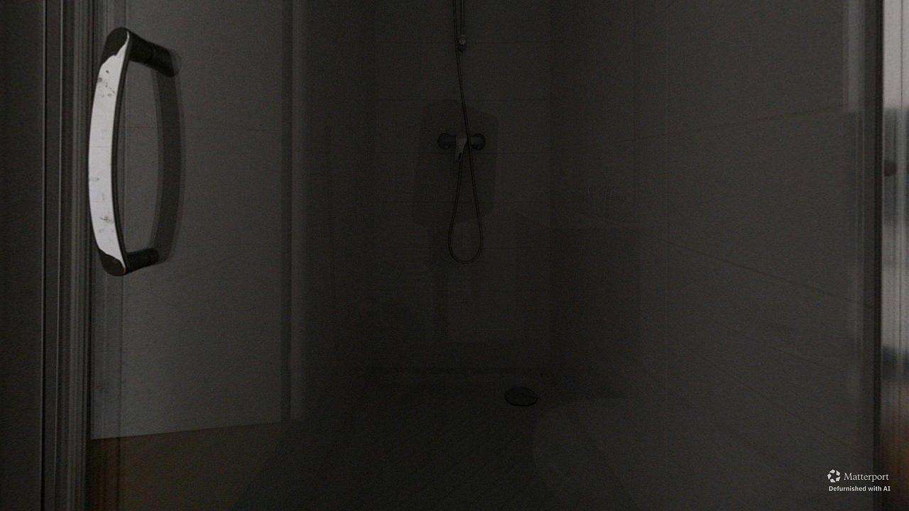 La salle d’eau comprend une douche spacieuse, un meuble vasque avec miroir, un WC, un sèche-serviette et des rangements.