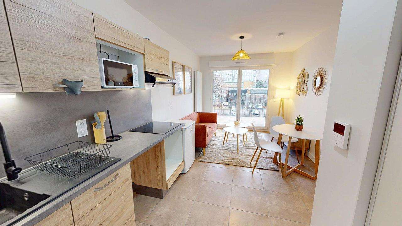 Cet appartement dispose d'une pièce de vie lumineuse et bien agencée. L’espace séjour s’ouvre sur un coin salon aménagé et un espace repas, le tout dans une ambiance contemporaine aux tons clairs et chaleureux. La cuisine, ouverte sur le séjour, est équipée de rangements modernes, d’une plaque de cuisson, d’un micro-ondes et d’un réfrigérateur, avec un plan de travail fonctionnel et des finitions soignées. Deux emplacements prévus permettent l’installation d’un four, d’un lave-vaisselle ou d’un lave-linge