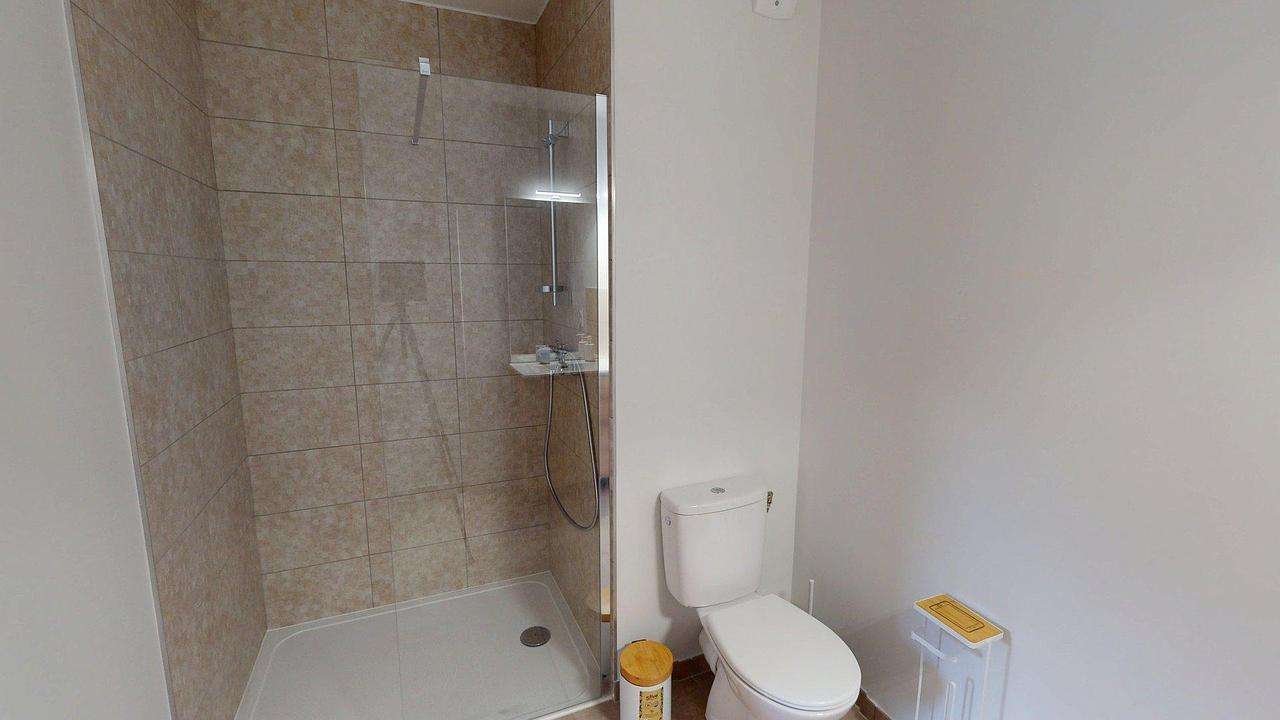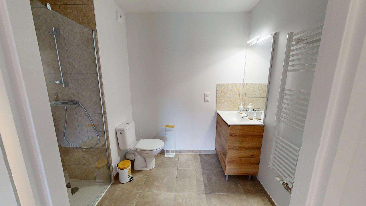 La chambre, séparée, offre un espace nuit confortable avec une belle luminosité naturelle. La salle d’eau dispose d’une douche, d’un meuble vasque avec miroir, de WC et d’un sèche-serviettes, dans un ensemble sobre et moderne.