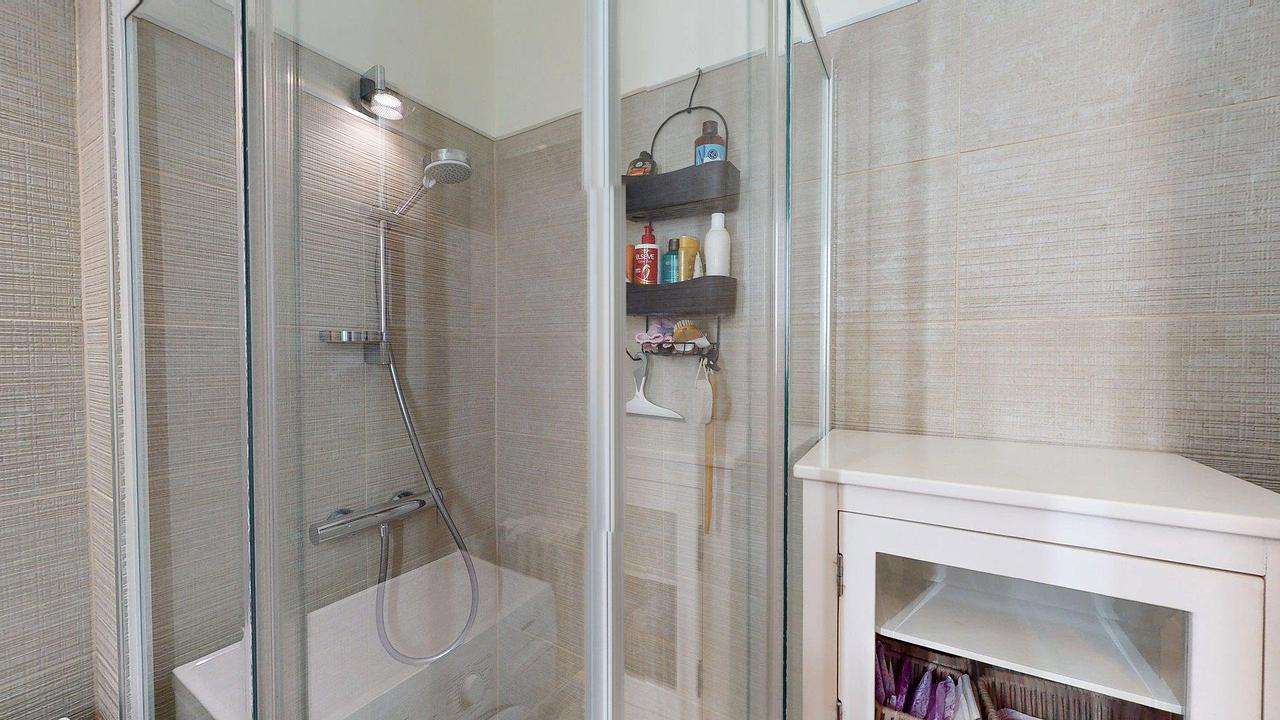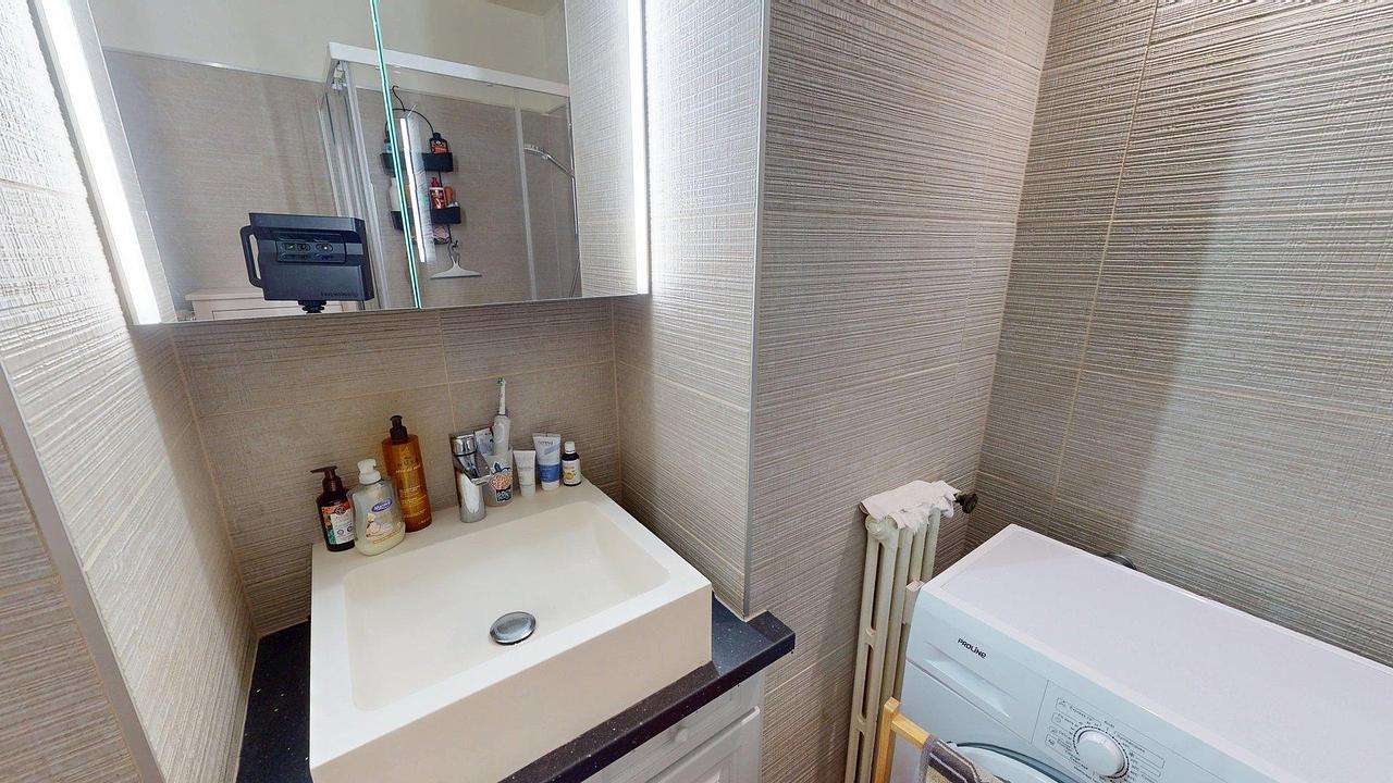 La salle d'eau comporte une douche, un meuble vasque avec miroir, lave-linge, ainsi que des rangements. Les WC sont séparés.