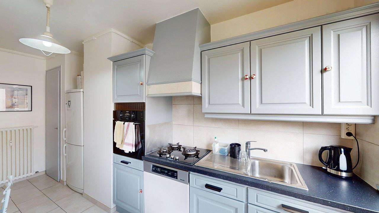 La cuisine est équipée d'un four, d'un micro-ondes, de plaques de cuisson, d'une hotte, d'un évier, d'un réfrigérateur avec compartiment congélateur, d'un lave-vaisselle, d'une table à manger et ses 3 chaises, ainsi que de nombreux rangements et ustensiles de cuisine. Elle donne directement sur une loggia avec table et chaises.