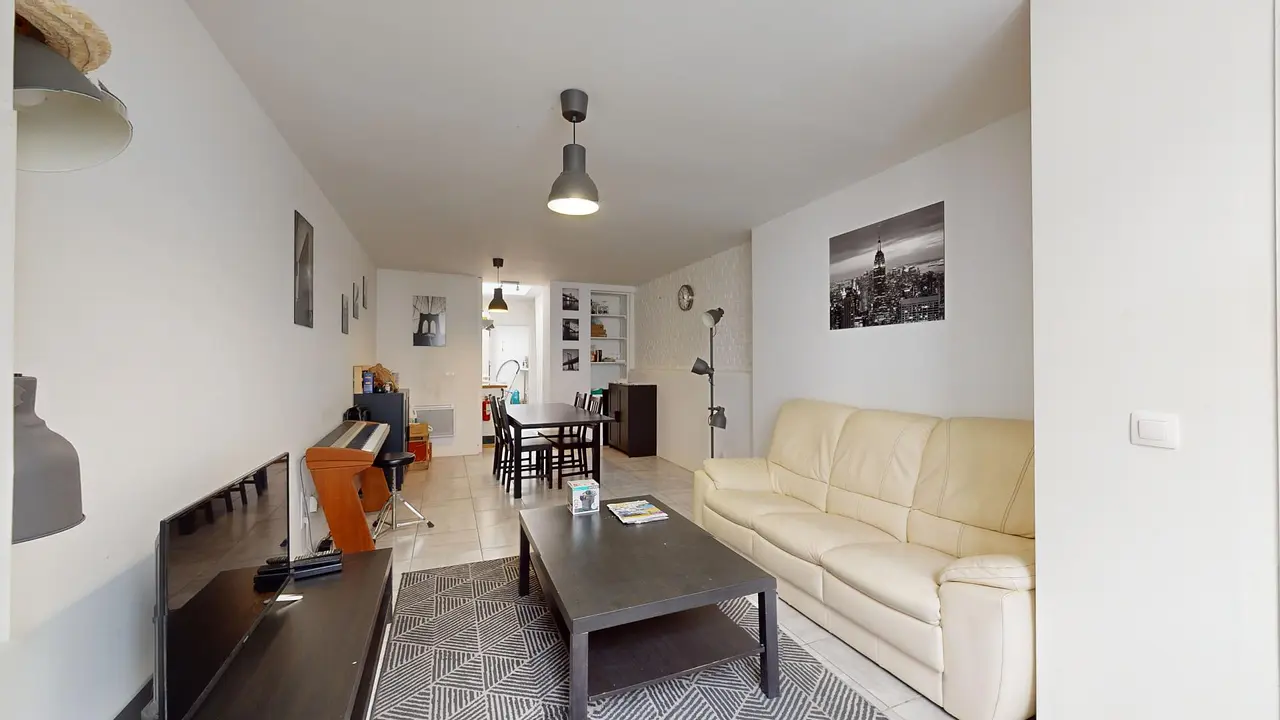 Le logement dispose d'un grand séjour équipé d'un canapé, d'une table basse, d'une télévision ainsi qu'un piano et d'un espace salle à manger.