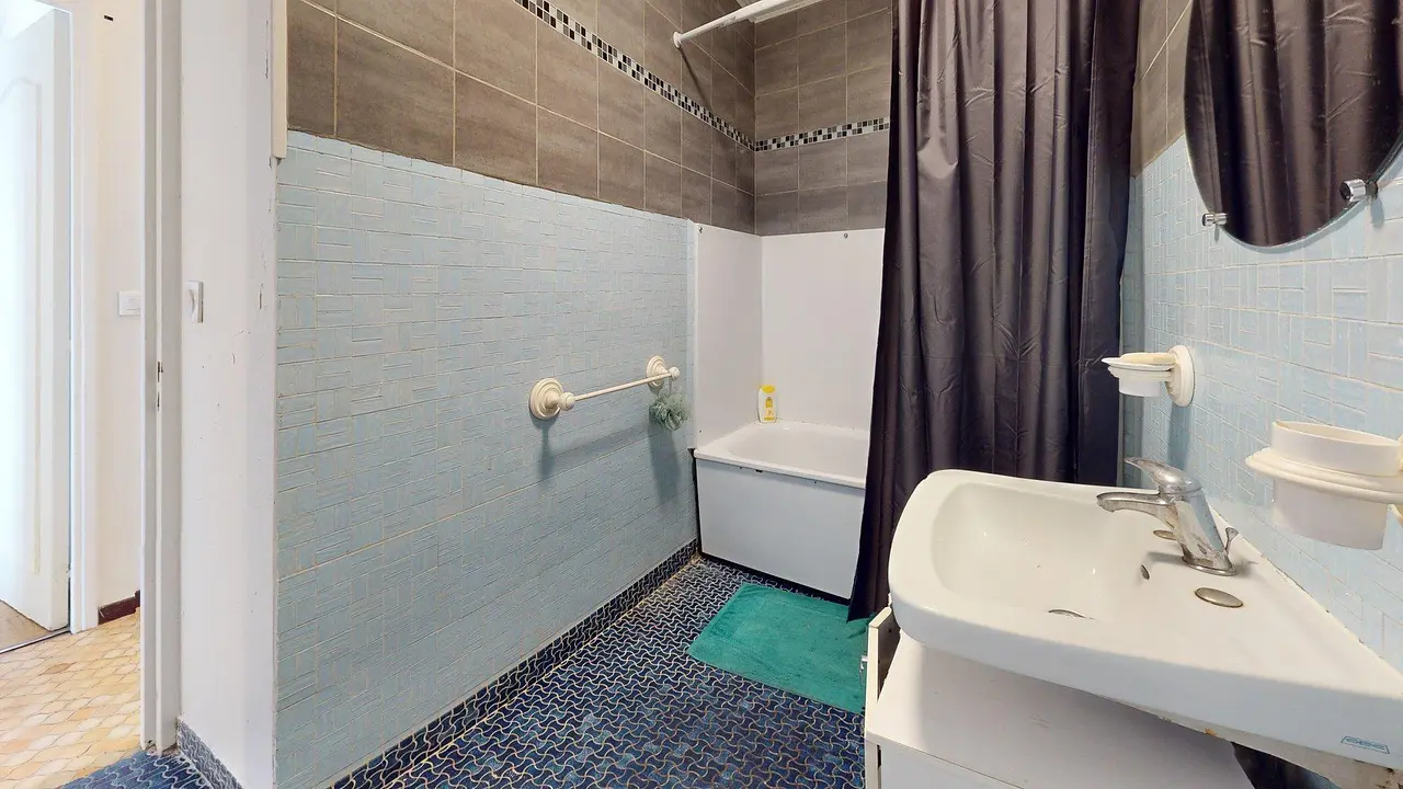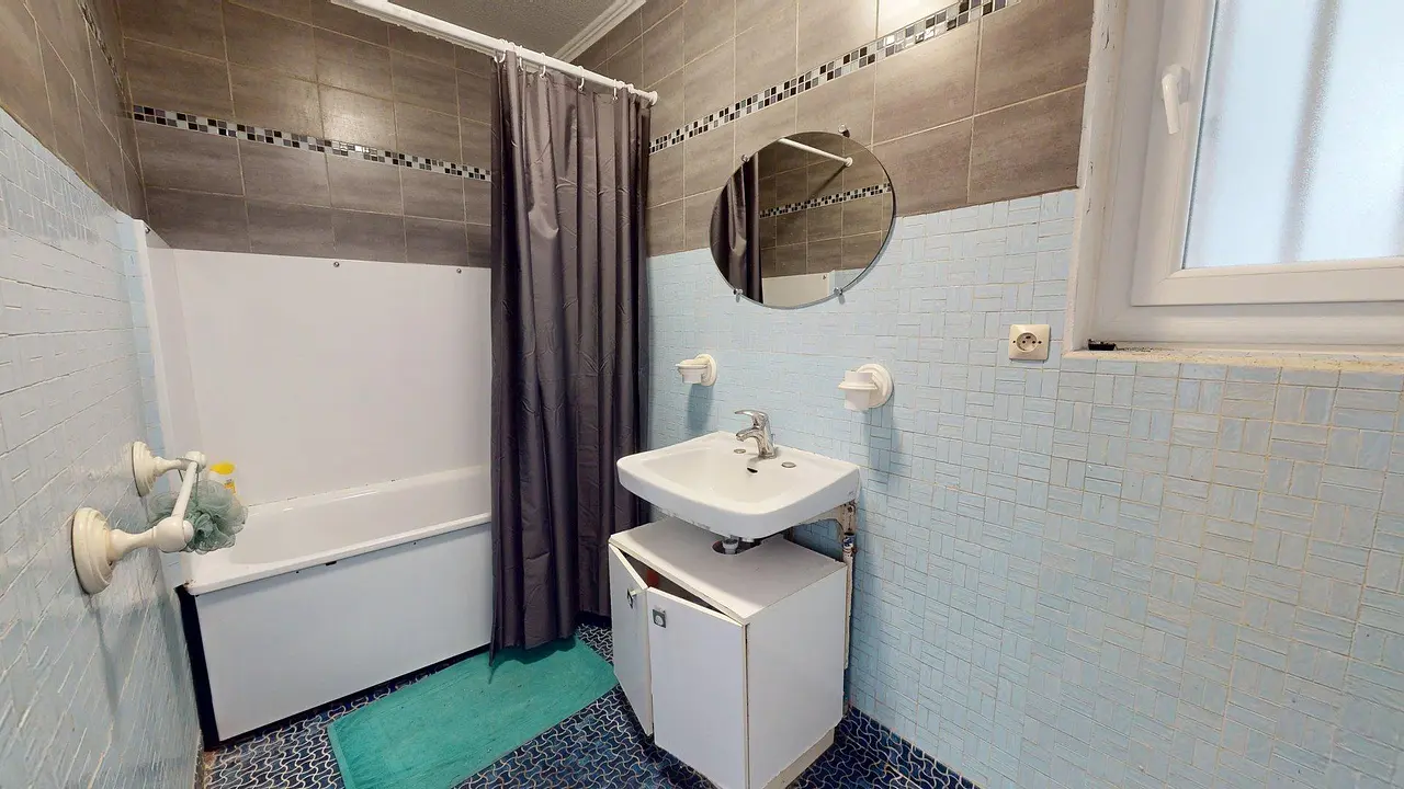 La salle de bain est fonctionnelle, avec une baignoire équipée d'un rideau de douche, un meuble vasque avec miroir et des rangements. Les WC sont séparés pour plus de confort.