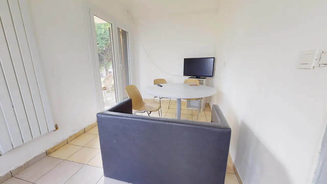 La pièce de vie est aménagée avec un canapé, une TV et une table à manger. Cette pièce de vie offre un accès direct au jardin de la maison.