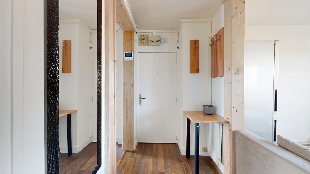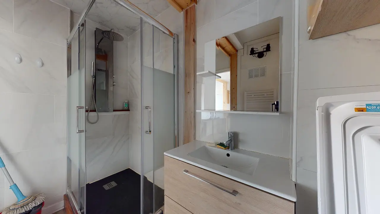 L'appartement présente une configuration où une entrée dessert l'ensemble des pièces. La cuisine, ouverte sur le salon, est bien équipée avec un réfrigérateur, des plaques de cuisson, une hotte, un four à micro-ondes, un lave-vaisselle, un évier, une machine à café, une bouilloire, une table haute et ses quatre tabourets. Dans la zone salon, vous trouverez un canapé, une table basse, une télévision ainsi que son meuble dédié. La salle de bain est dotée d'une cabine de douche, d'un meuble vasque et d'une machine à laver. De plus, les toilettes disposent également d'un meuble vasque.