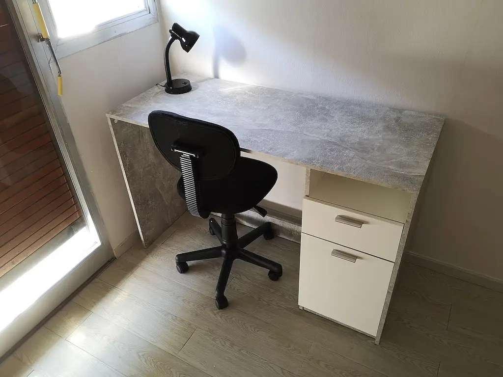 Cette chambre de 13,33m2 dispose d'un lit double, d'un bureau avec une chaise, d'un meuble bibliothèque ainsi que d'un placard dressing.
