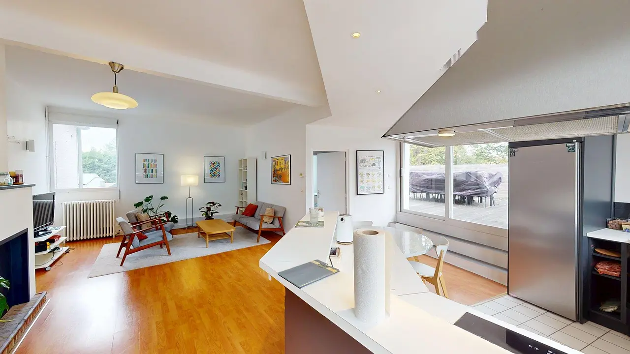 Cette grande pièce à vivre dessert également sur une terrasse, qui vous permettra de gagner en espace et en confort.