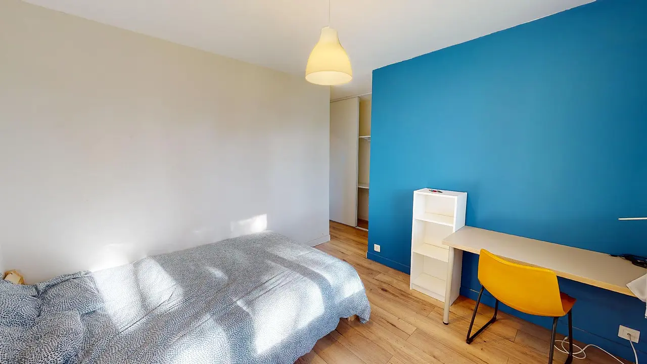 Cette troisième chambre de la colocation est dotée d’un lit double, d’une table de chevet et lampe, d’un grand placard mural, d’un bureau, chaise et lampe.