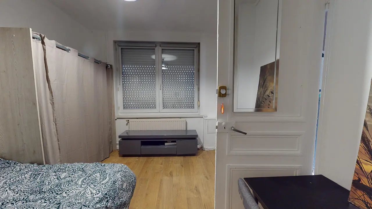 Située au dernier étage de la colocation, cette chambre est meublée par un lit double, un placard de rangement ainsi que d'un bureau et d'une chaise