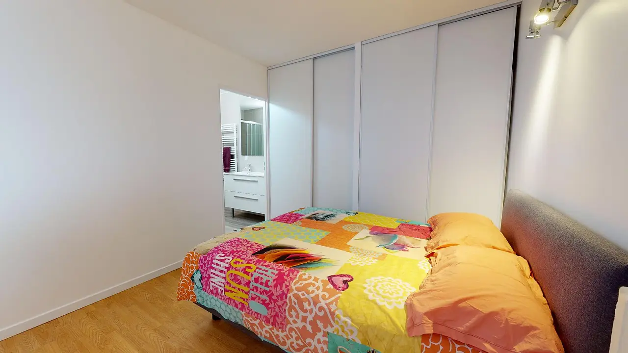 🛏️ La chambre est équipée d’un lit double et possède deux grands placards muraux avec portes coulissantes.