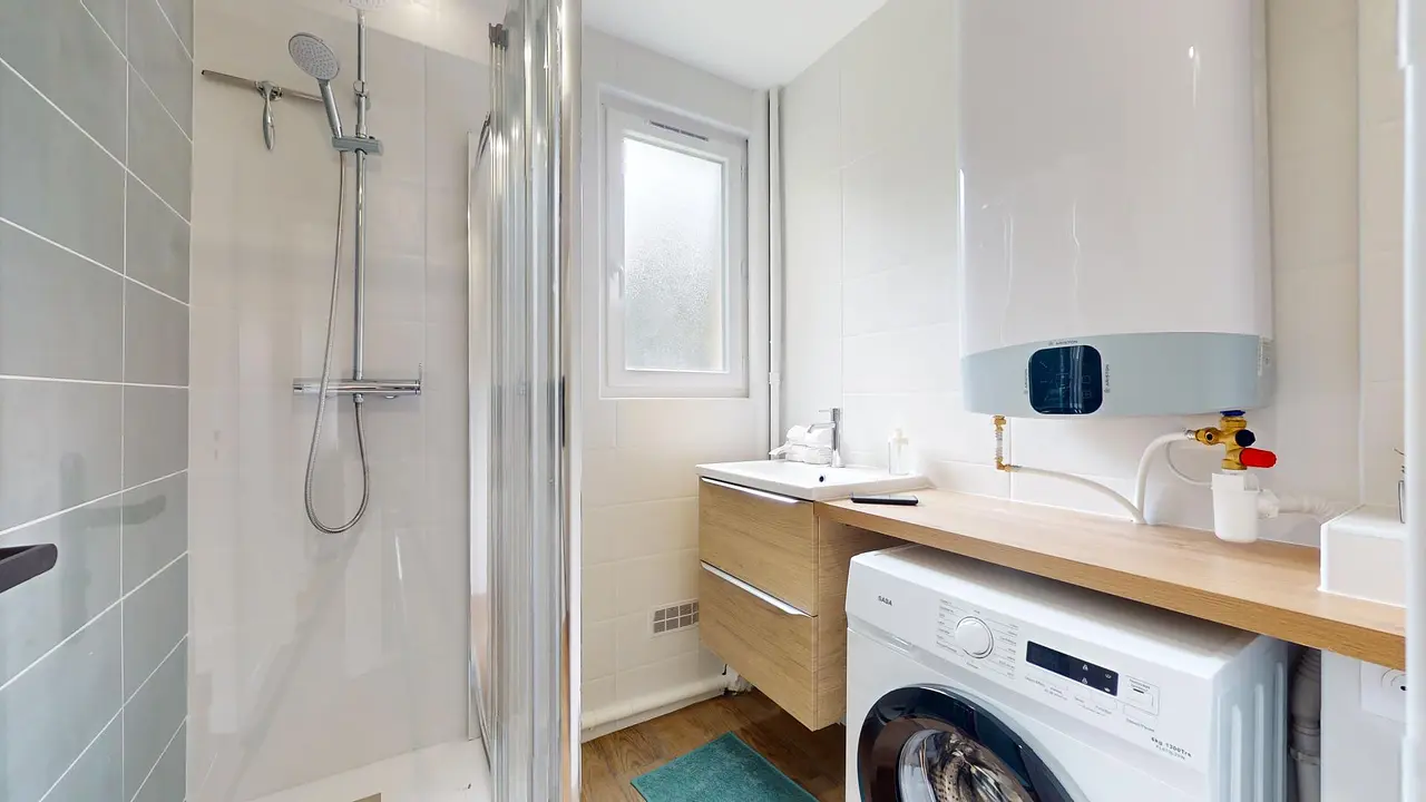 Deux salles d'eau complètent cet appartement : l'une avec meuble vasque, douche et lave-linge, la seconde avec meuble vasque, douche et toilettes.