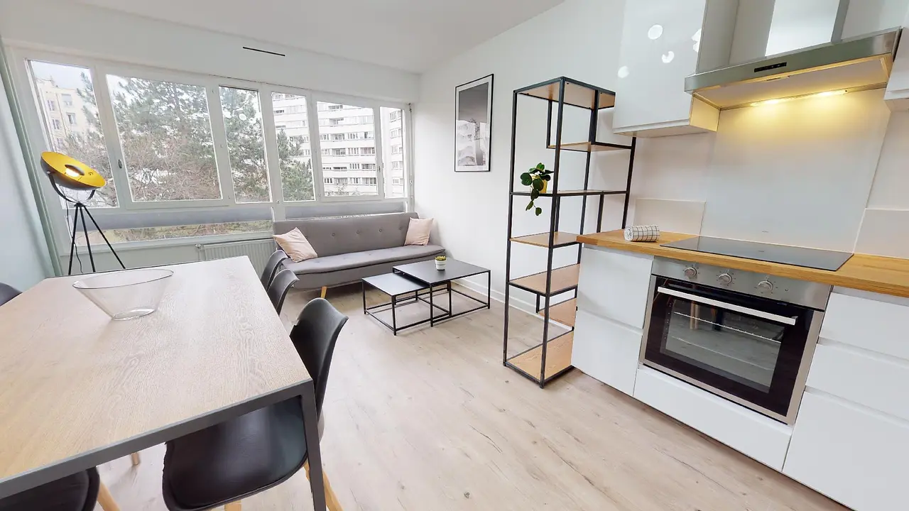 Le coin cuisine avec salle à manger se compose d'une grande table avec six chaises, idéal pour partager des repas entre colocataires. La cuisine est équipée d'un réfrigérateur avec congélateur, un lave vaisselle, un évier, un micro-ondes, un four, des plaques à induction avec une hotte et de nombreux rangements.