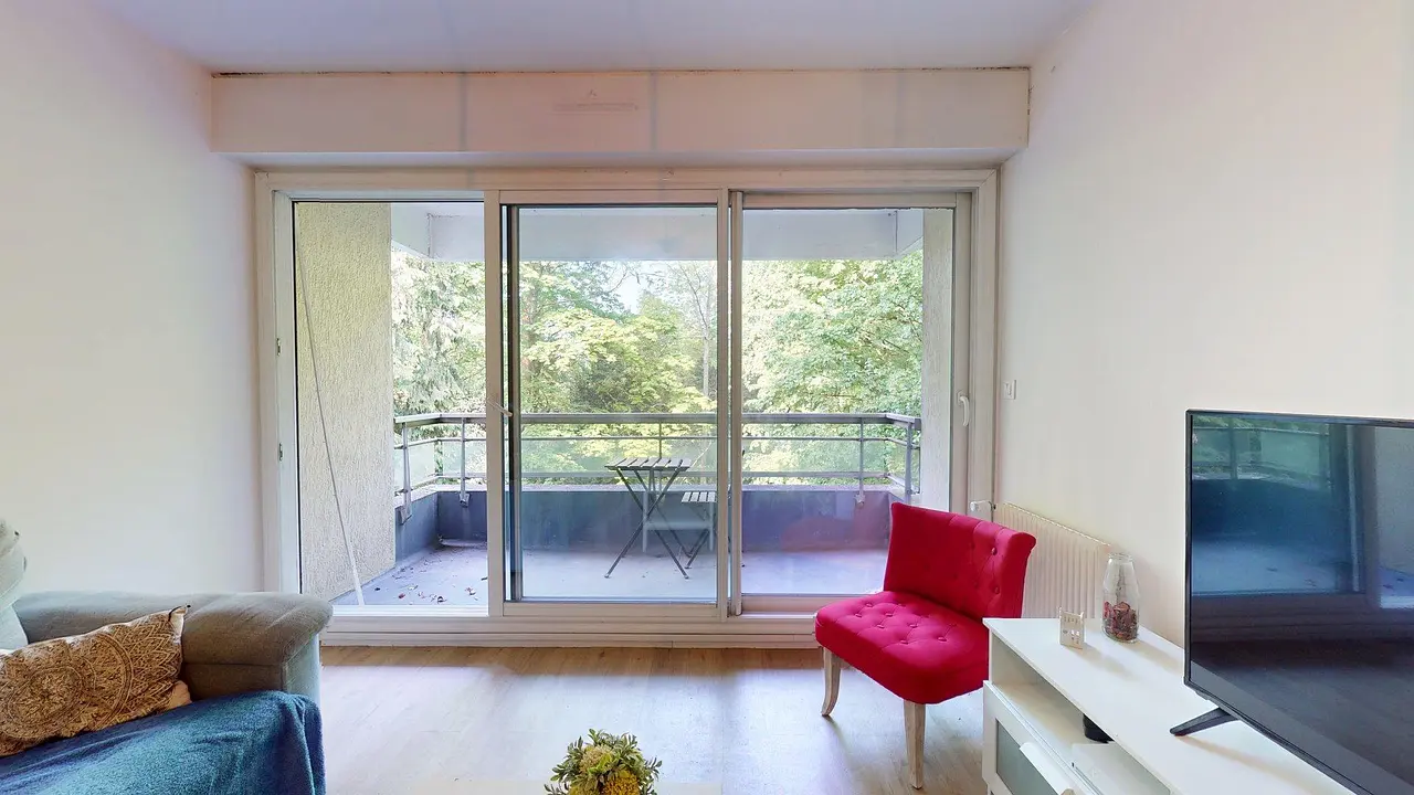 Le séjour spacieux et agréable ouvre sur un balcon sans vis-à-vis, parfait pour se détendre en pleine nature. Il est meublé avec deux canapés, TV et meuble TV, fauteuil et table basse. L'entrée dispose d'un grand placard de rangement.