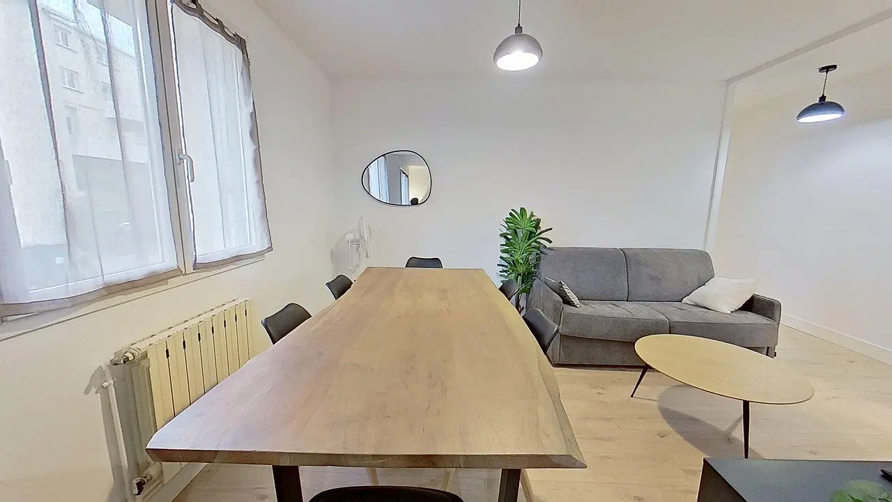 Le logement s’ouvre sur une agréable pièce de vie baignée de lumière naturelle, dotée d’un sol en parquet clair qui apporte une atmosphère chaleureuse et contemporaine. L’espace salon est aménagé avec un canapé gris, une table basse ronde en bois clair et une télévision fixée au mur, formant un ensemble fonctionnel et convivial. L’espace salle à manger accueille une grande table en bois massif entourée de six chaises assorties, idéale pour les repas et les moments partagés.