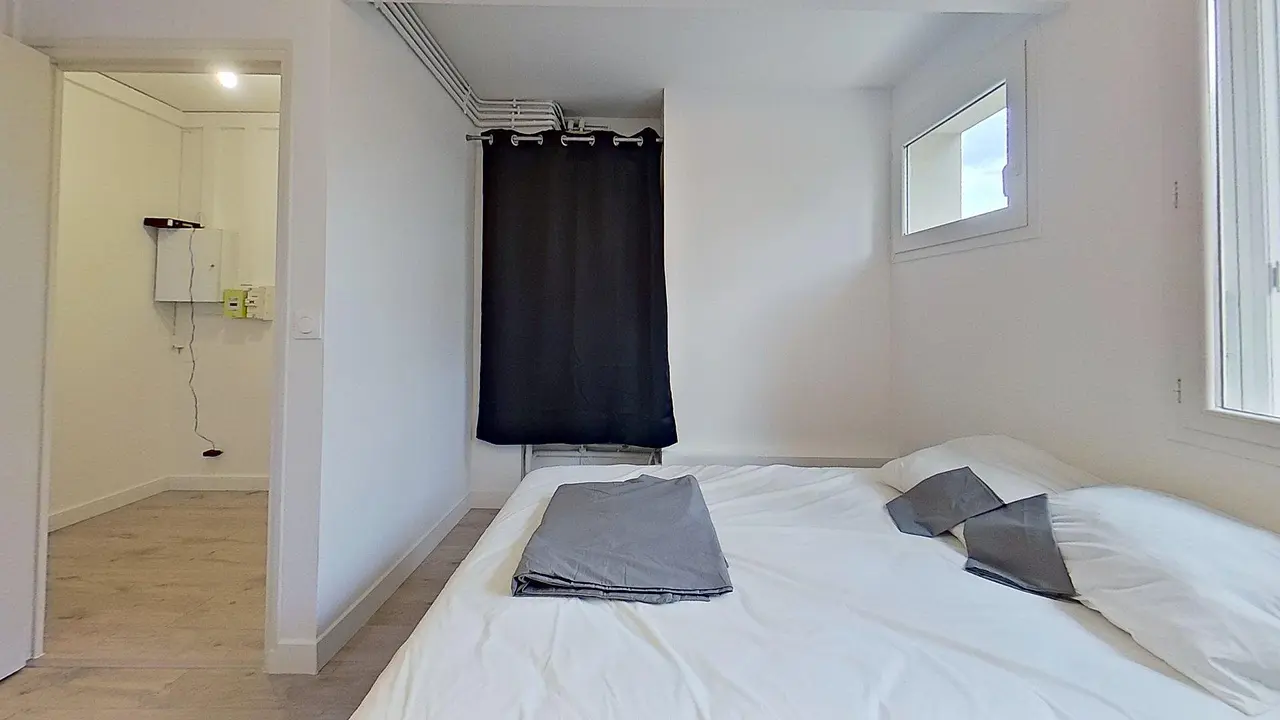 Le logement dispose de trois chambres distinctes, toutes aménagées avec un lit double. Chaque chambre bénéficie de rangements grâce à une commode ou un portant, ainsi que d’un mobilier complémentaire selon la configuration. Les sols en parquet clair et les tons neutres créent une ambiance calme et reposante, propice à l’installation immédiate.