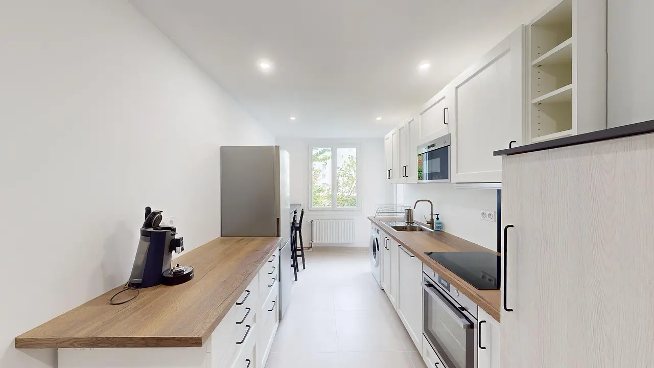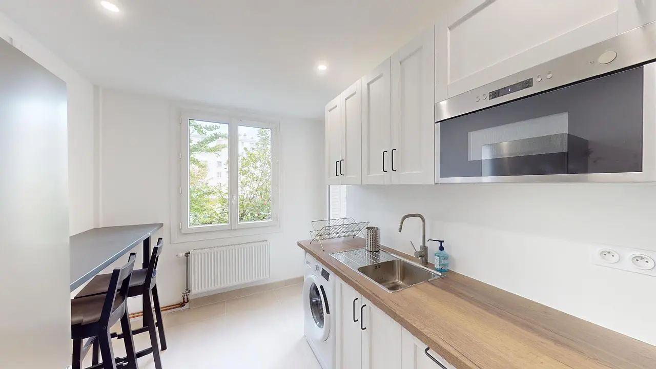 Cette colocation s'articule autour d'un espace combiné cuisine et salle à manger, équipé d'une table et de chaises. La cuisine est pourvue de tous les équipements essentiels, notamment une plaque de cuisson avec hotte, un four, un micro-ondes, une machine à laver, et un réfrigérateur. De plus, elle s'ouvre sur un petit balcon d'une place, idéal pour prendre l'air et faire sécher le linge.