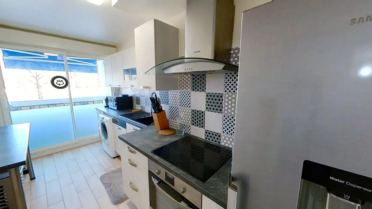 La cuisine est entièrement équipée d'un four, de plaques de cuisson, d'un frigo, d'un micro-onde, d'une machine à laver etc. L'accès au balcon se fait également par la cuisine.
