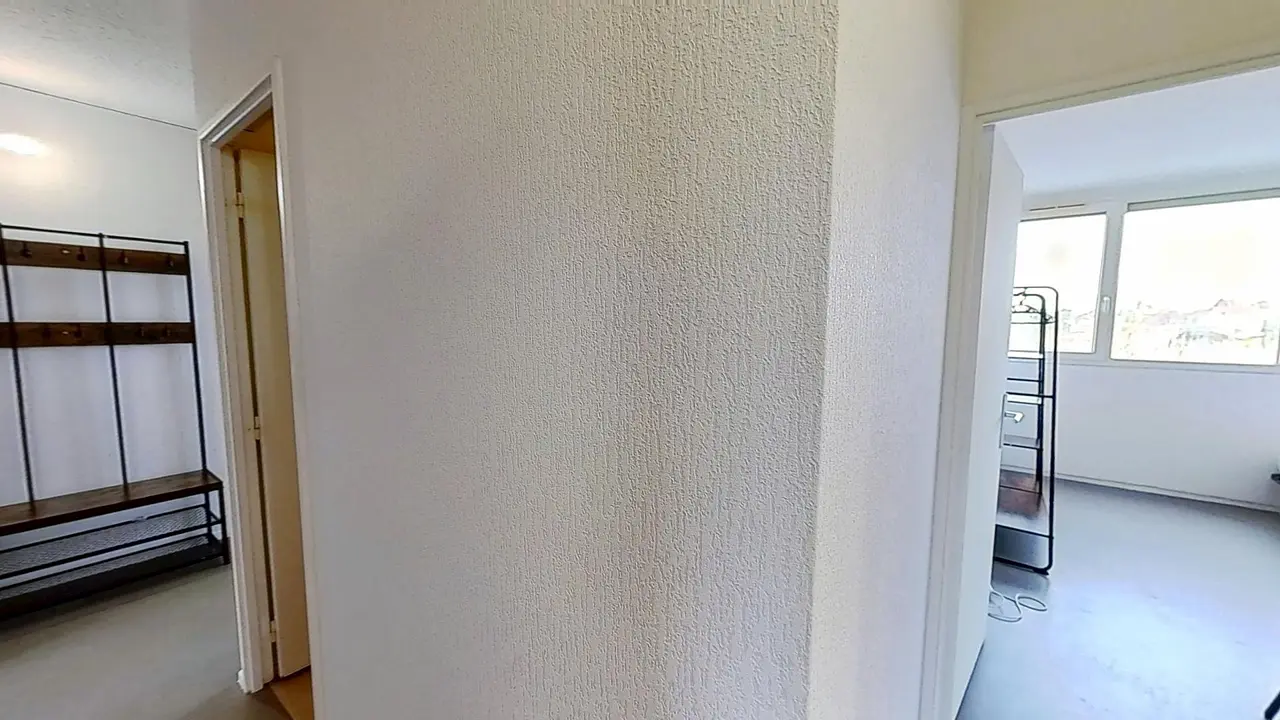 Cette colocation de 3 chambres s'ouvre sur une entrée aménagée d'un meuble porte-manteau. La cuisine est équipée d'un évier avec un égouttoir, d'un réfrigérateur avec un congélateur, d'une machine à laver, d'un micro-ondes, de plaques de cuisson ainsi que de rangements et d'une table avec trois chaises.