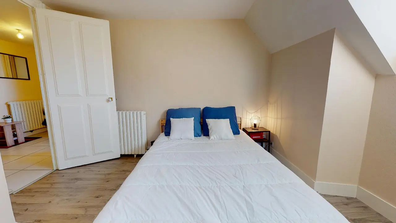 La chambre 3 dispose d’un confortable coin nuit avec un lit double, une table de chevet et un grand placard, ainsi qu’un espace travail avec un bureau, idéalement situé sous un velux. La literie (couette, oreiller) est également fournie.
