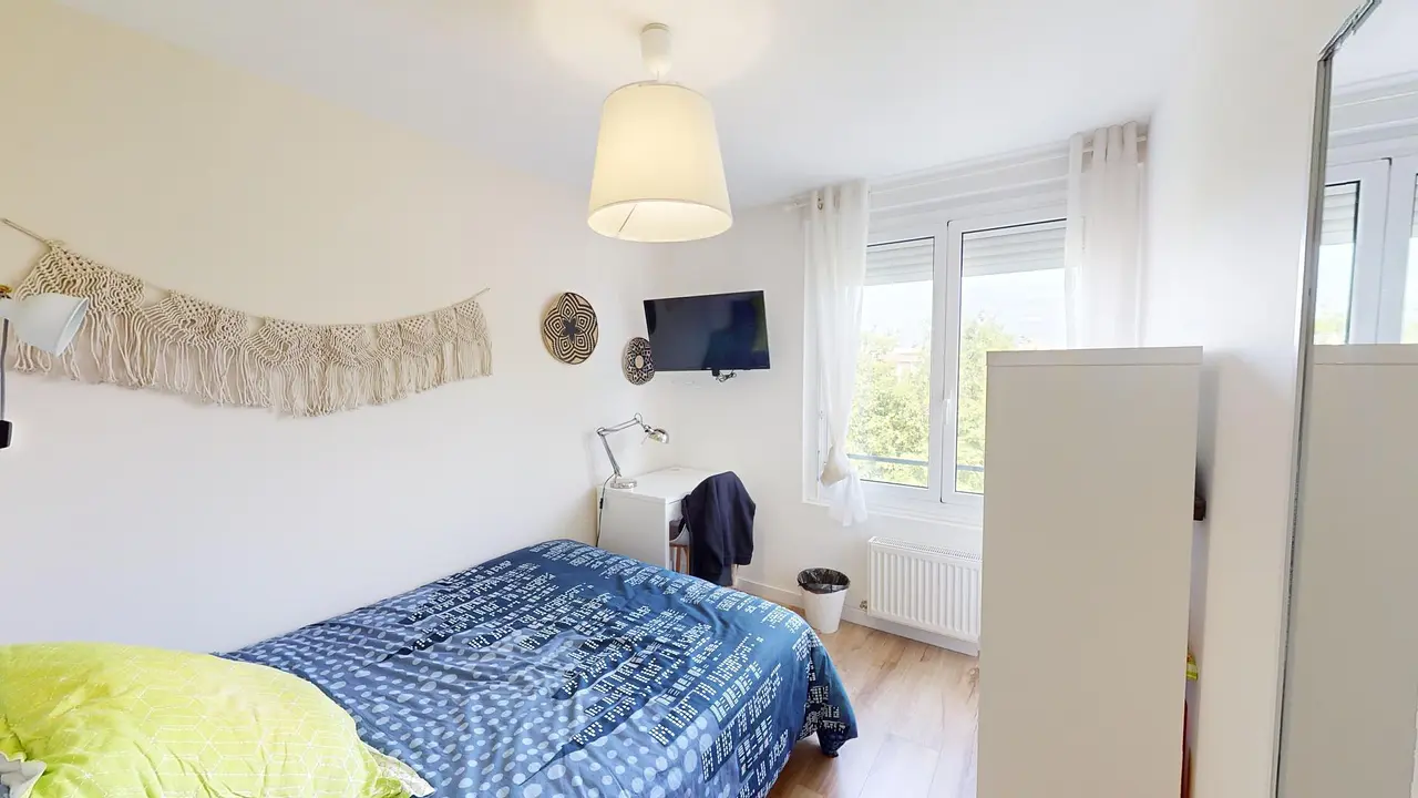 Cette chambre dispose d'un lit double, d'une table de chevet, d'une penderie, d'un meuble de rangement, d'un bureau avec une chaise et d'une TV. Le locataire n'a plus qu'à poser ses valises.