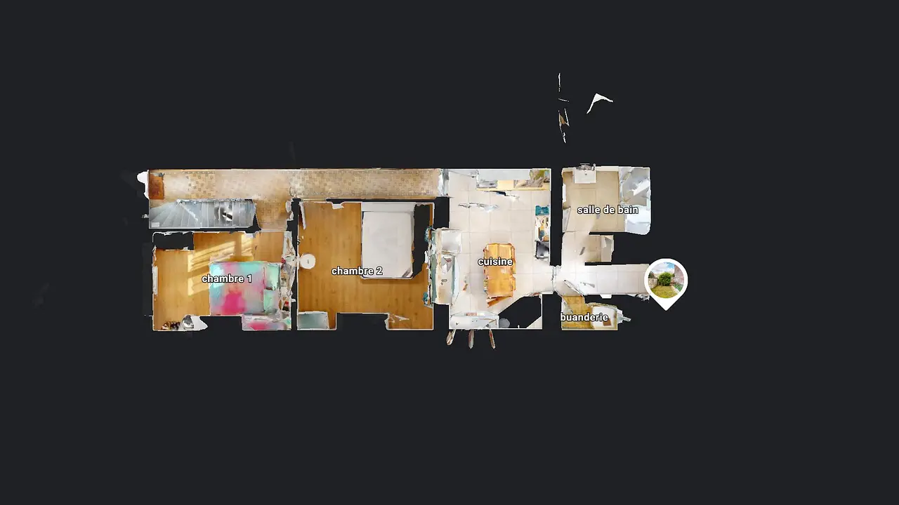 Au rez de chaussée, vous disposez des pièces communes: cuisine, buanderie, salle de bain et toilette, d'un jardin ainsi que l'accès à 2 chambres.