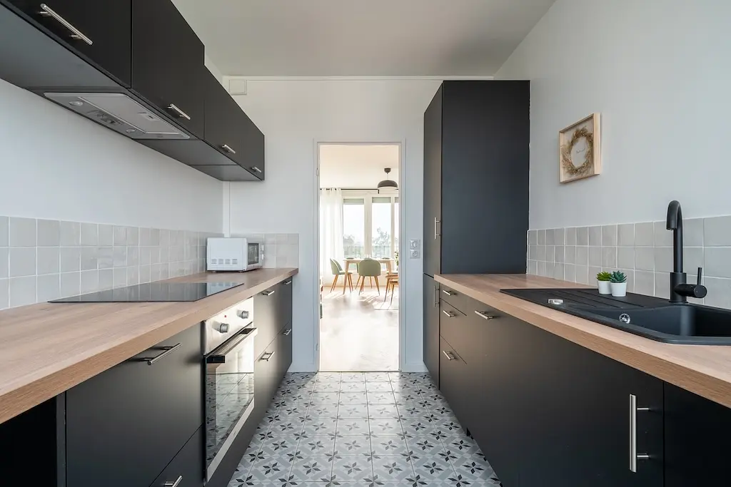 - D'une belle cuisine en longueur, équipée d'un réfrigérateur/congélateur, de plaques de cuisson, d'un lave-vaisselle, d'un four, d'un micro-ondes, d'un évier et d'une bouilloire.