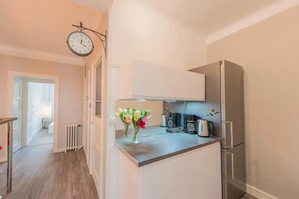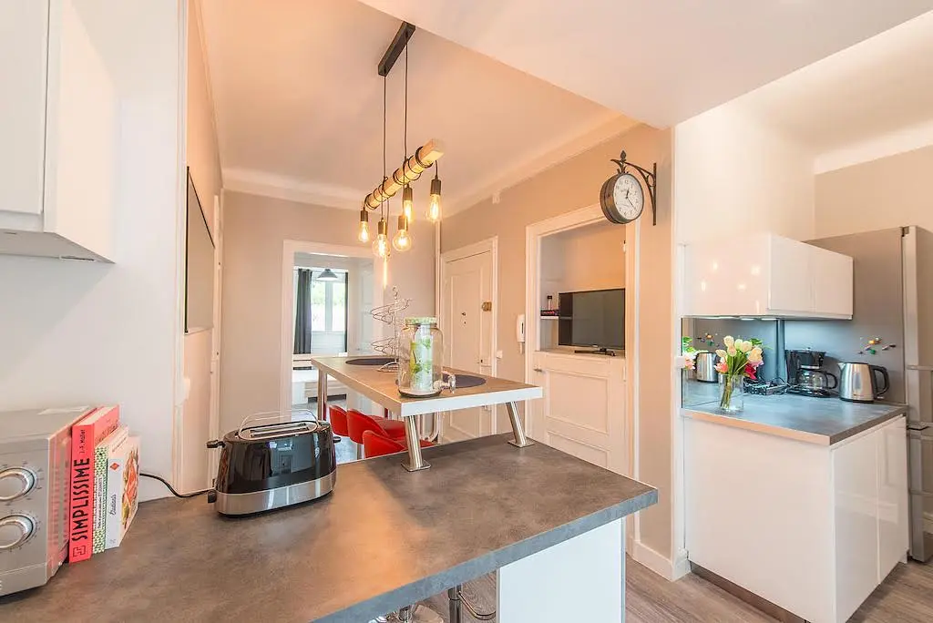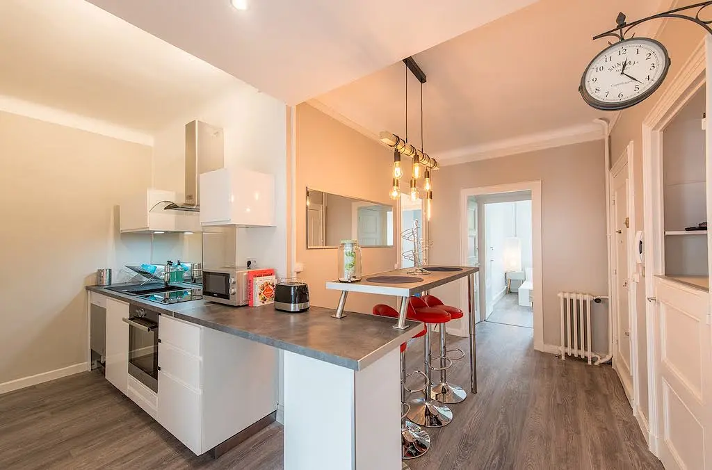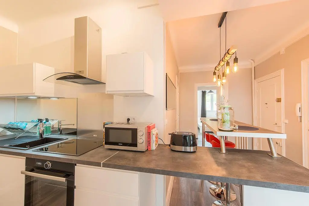 Les parties communes comprennent une cuisine moderne ouverte équipée avec tout le nécessaire : vaisselle, micro-ondes, four, lave-vaisselle, plaques de cuisson, etc.