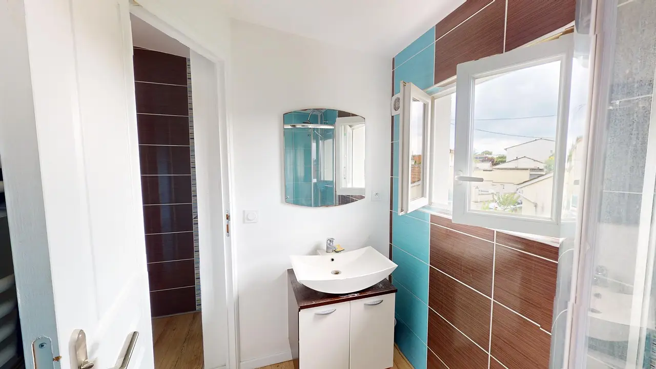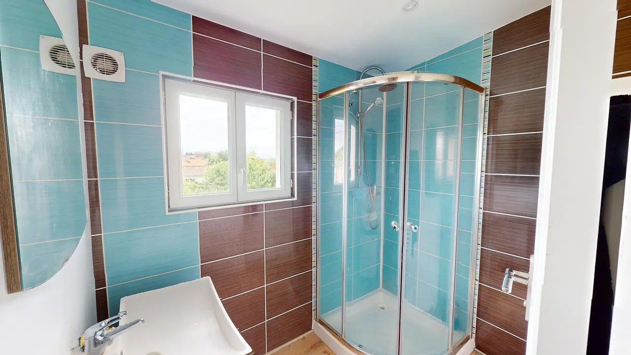 Deux salles de bain partagées complètent ce bien : l'une au rez-de-chaussée avec douche, meuble vasque, miroir, sèche-serviette et WC ; et la seconde à l'étage avec cabine de douche, meuble vasque, miroir et sèche serviette. Ces deux salles de bain sont chacune partagées entre 2 des colocataires, les autres colocataires ont des salles d'eau privées.