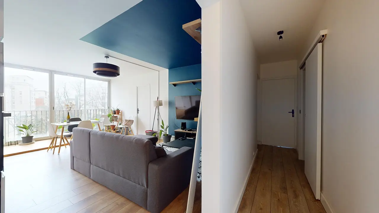 Cet appartement de 5 pièces s'ouvre sur une entrée avec rangements desservant un séjour avec cuisine ouverte. Celui-ci dispose d'un espace salon avec canapé, table basse, meuble TV et TV et d'un espace salle à manger, parfait pour partager des repas entre colocataires.